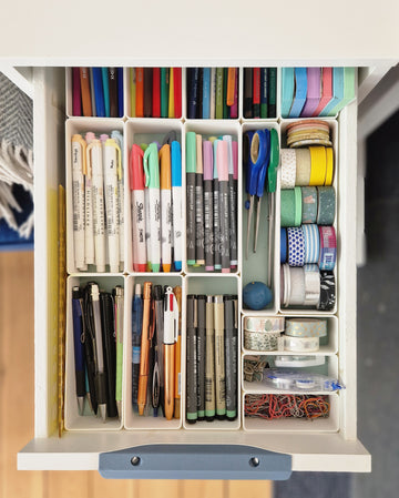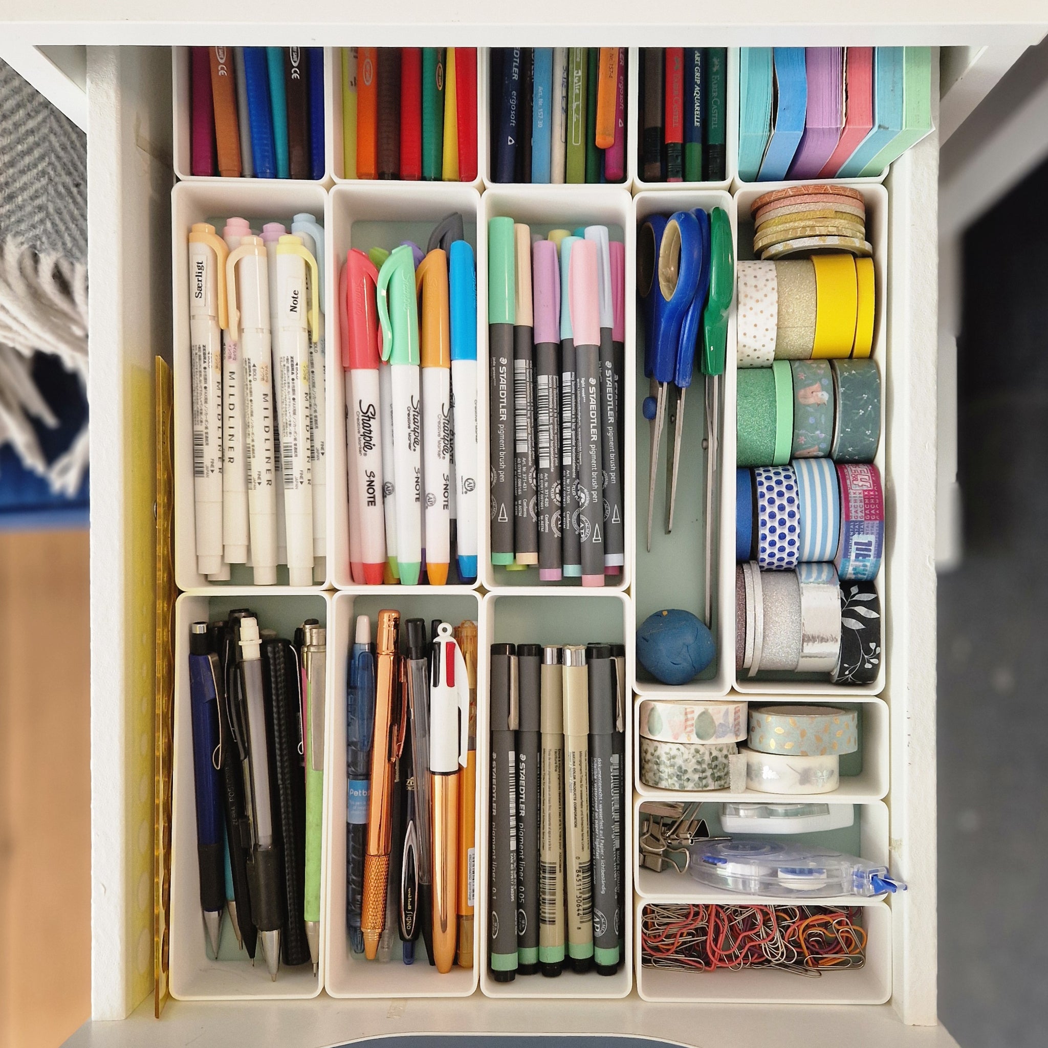Skuffe indsatser til at huse de mange skriveredskaber jeg ejer. Nemme at tage med til arbejdsbordet og gør det nemt at rydde op igen bagefter. Eget Design. PLa Filament.
