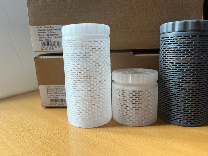 Beholder til Silica Gel Beads i 3DE Premium ABS. Begge dele printet på en Bambu P1S.
