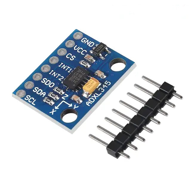 ADXL345 är en liten, tunn 3-axlig accelerometer med mycket låg strömförbrukning och hög upplösning (13 bitar) som mäter upp till ±16 g. Digitala utdata formateras som ett 16-bitars tvåkomplement och kan nås via antingen ett SPI-gränssnitt (3- eller 4-trådsgränssnitt) eller ett digitalt I2C-gränssnitt.