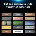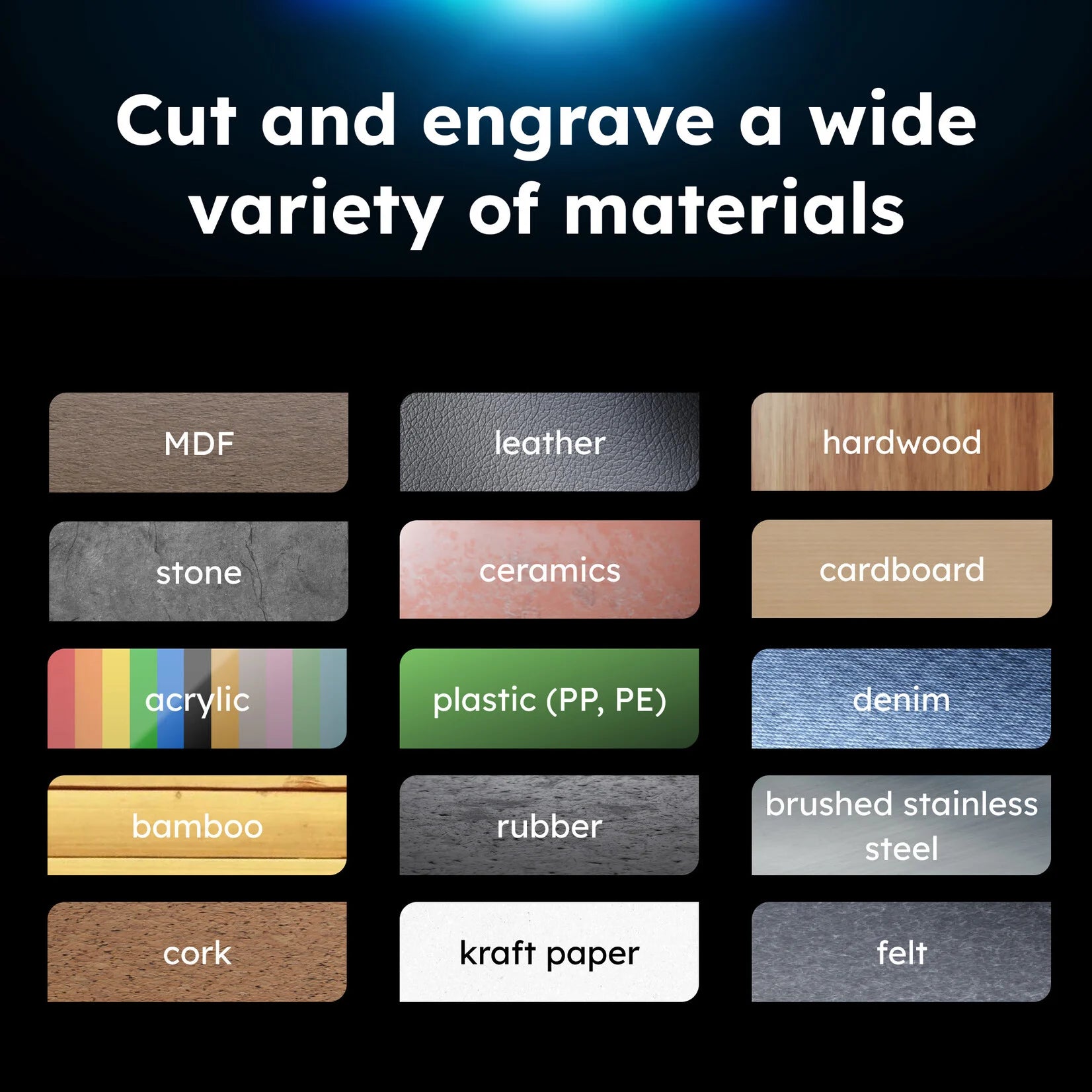 Velegnet til træ, akryl, læder, plast, tekstiler og meget mere – uden behov for modulskift.