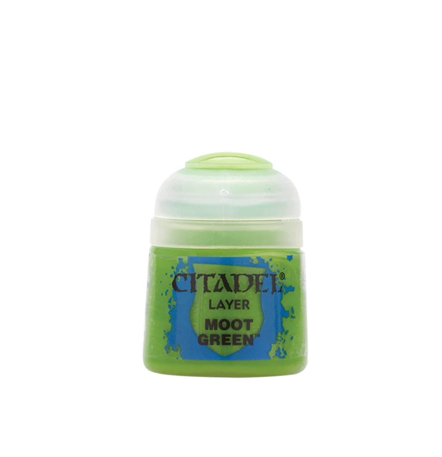 Citadel Layer er akrylmaling der bruges til at male ydre lag ovenpå en basecoat for at give definition og fremhæve detaljer. Denne bøtte indeholder 12ml Moot Green.