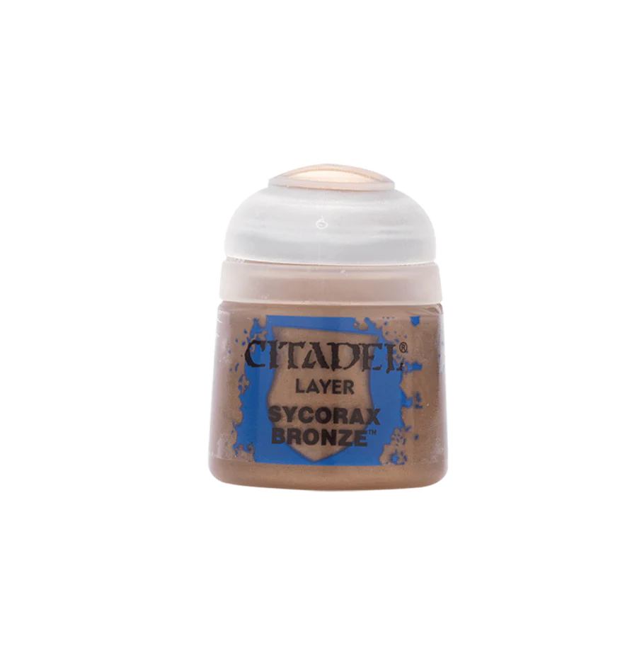 Citadel Layer er akrylmaling der bruges til at male ydre lag ovenpå en basecoat for at give definition og fremhæve detaljer. Denne bøtte indeholder 12ml Sycorax Bronze.