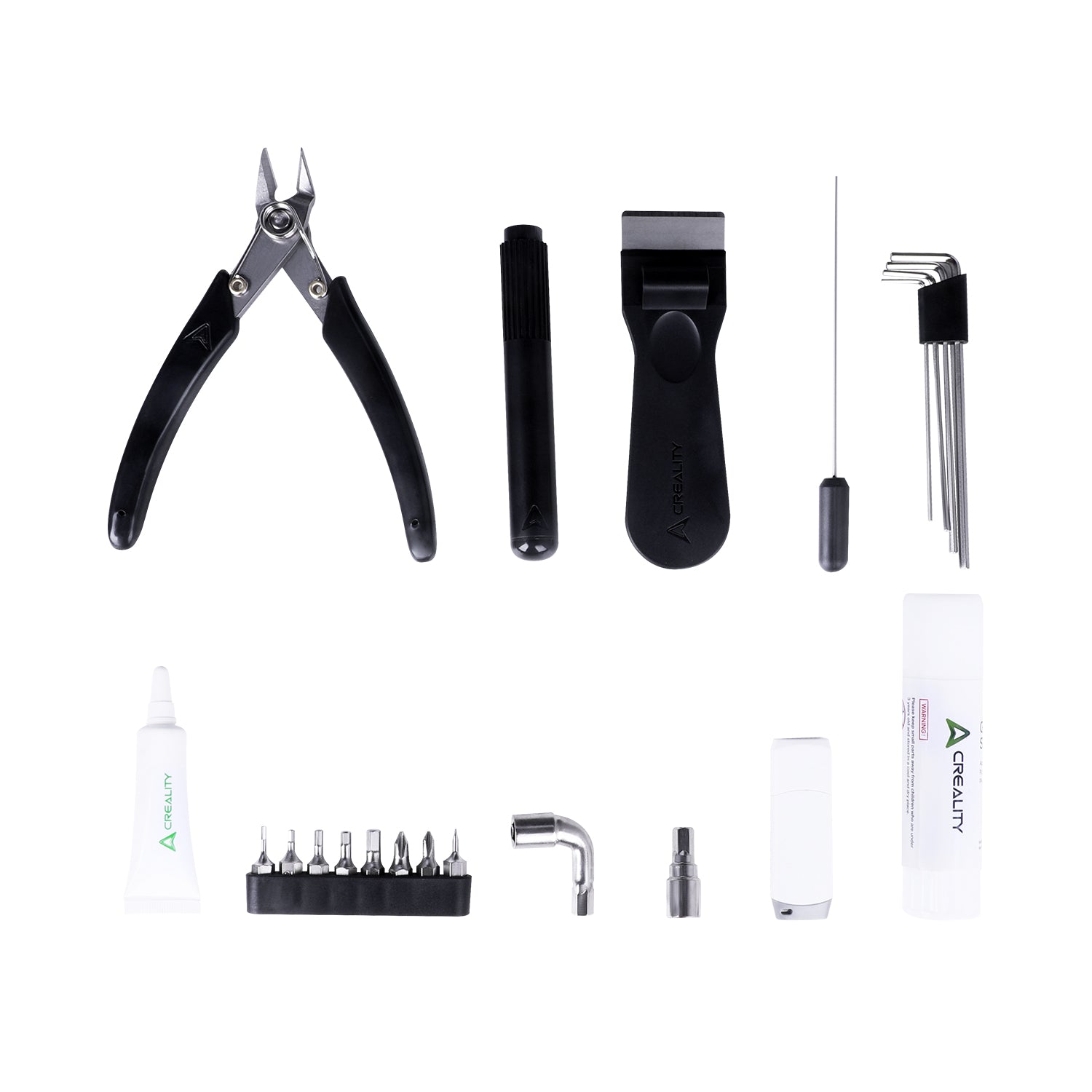 Gör underhåll och justering av din 3D-skrivare både enkelt och effektivt med detta allmänna verktygssats från Creality. Satsen består av alla de viktigaste verktygen du behöver för daglig service, kalibrering och installation - från nivåjustering till munstycksbyte och rengöring av axeln.