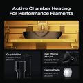 Utrustad med ett munstycke av härdat stål, en uppvärmd kammare (upp till 60 °C) och en högflödes-hotend (40 mm³/s), hanterar K2 Pro enkelt avancerade material som: