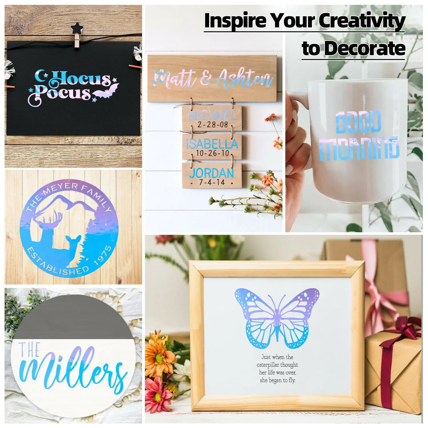 HTVRONT holografisk vinyl finns i en mängd olika högkvalitativa färger till ett överkomligt pris. Denna vinyl skiftar vackert i varje färg. Med en glittrande finish låter denna självhäftande folie dig skapa fler unika och fantastiska projekt.