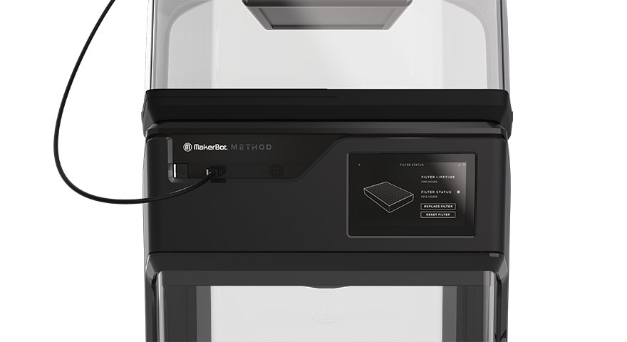 När det är dags att byta filter meddelar Clean Air dig via pekskärmen på din METHOD 3D-skrivare. Knäpp bara ut det gamla filtret och skjut in ett nytt – inga verktyg behövs.
