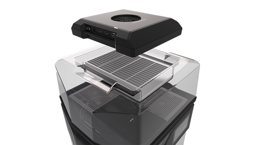 - Integreras direkt i Method-seriens skrivare, vilket möjliggör fläktstyrning beroende på vilket material som skrivs ut