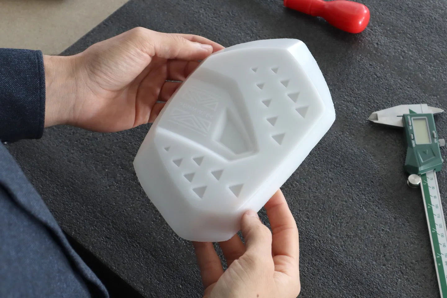 3D printed drage som lige er strikket.