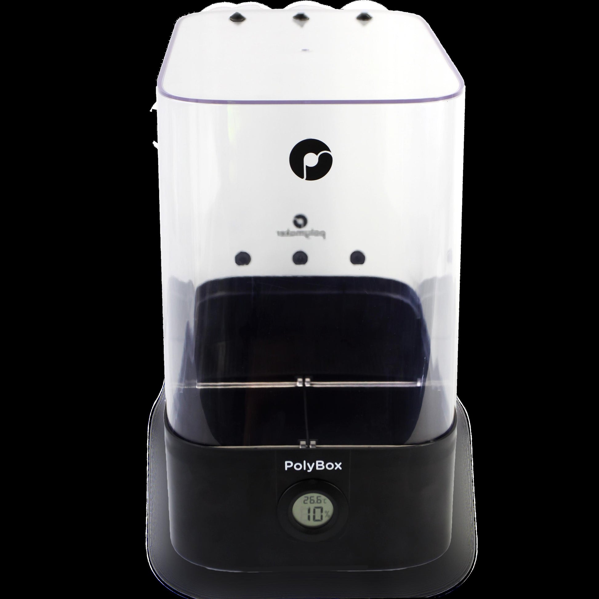 PolyBox™ är en förvaringslåda för filament som låter dig förvara dina material i optimal utskriftsmiljö samtidigt som du fortfarande kan skriva ut med dem. PolyBox™ är utrustad med en termohygrometer för att övervaka dina filament inuti lådan. Fuktigheten regleras av stora torkmedelspåsar som absorberar fukt från luften inuti PolyBox™, speciellt utformade för hygroskopiska material som PolySmooth™, PVA eller nylon. PolyBox™ kan hålla två 1 kg spolar åt gången eller en 3 kg spole och är kompatibel med både 1,75 mm och 2,85 mm filamentdiametrar.