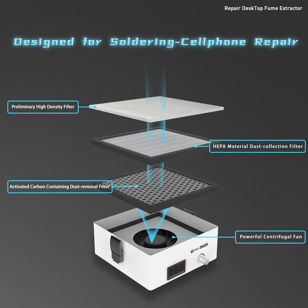 - Den filtrerar och renar skadliga ångor bort från teknikern under lödning och omarbetning i alla miljöer. Installationen är enkel och bekväm, utan behov av alternativa rör. Trippelfilterdesign för att säkerställa att den kan filtrera bort de skadliga ämnena i röken. Förfiltret, medeleffektivitetsfiltret och huvudfiltret kan bytas ut individuellt, vilket förlänger huvudfiltrets livslängd.