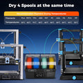 Høj varme og hurtig opvarmning – Enheden kan tørre filamenter op til omkring 85 °C i de uafhængige kamre, hvilket effektivt fjerner fugt og mindsker risiko for printfejl.