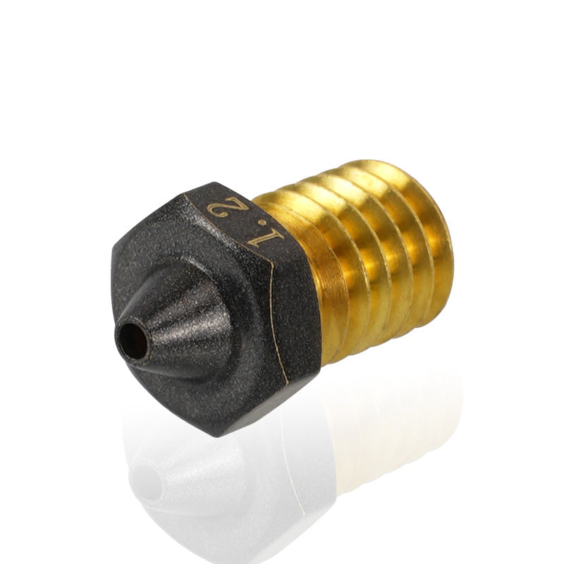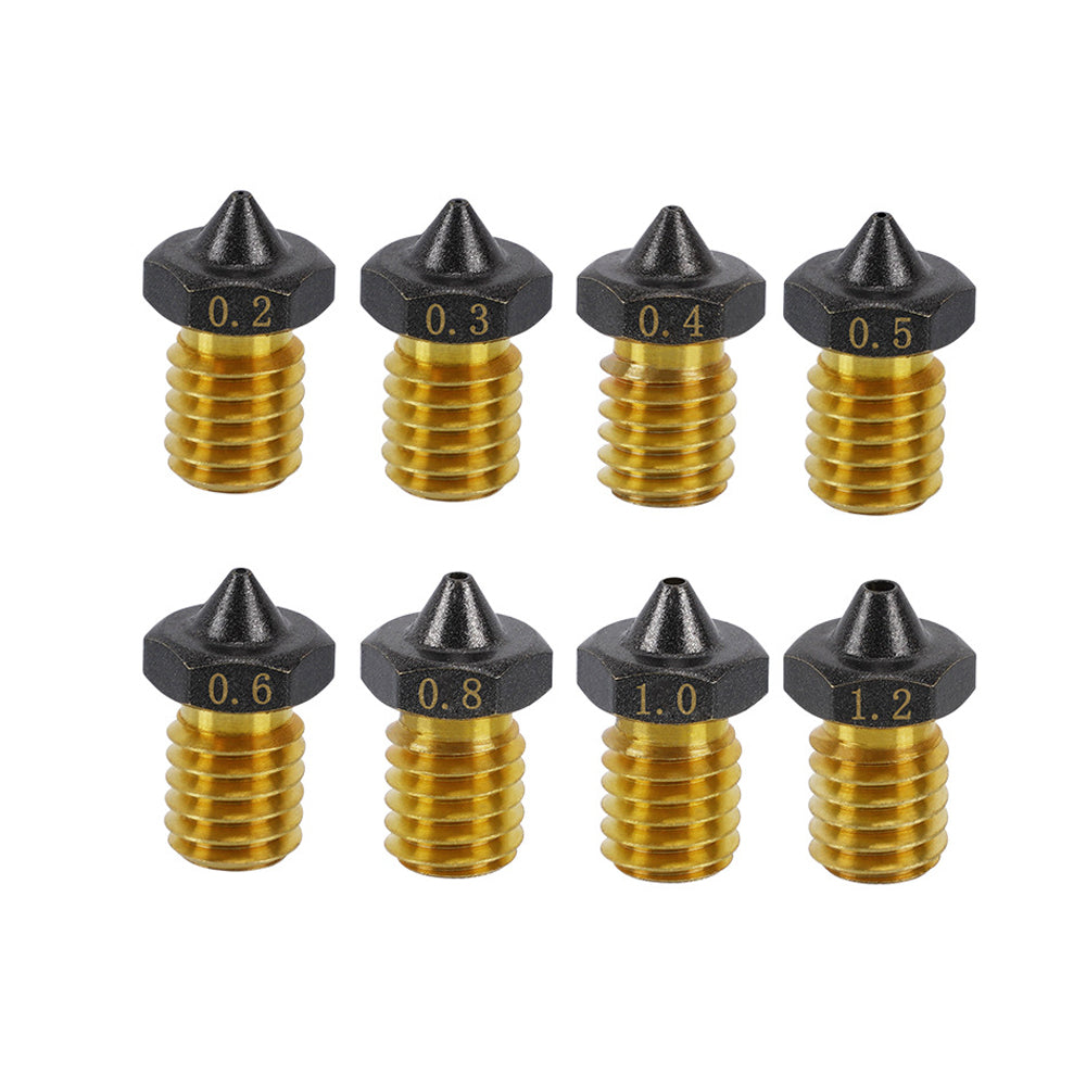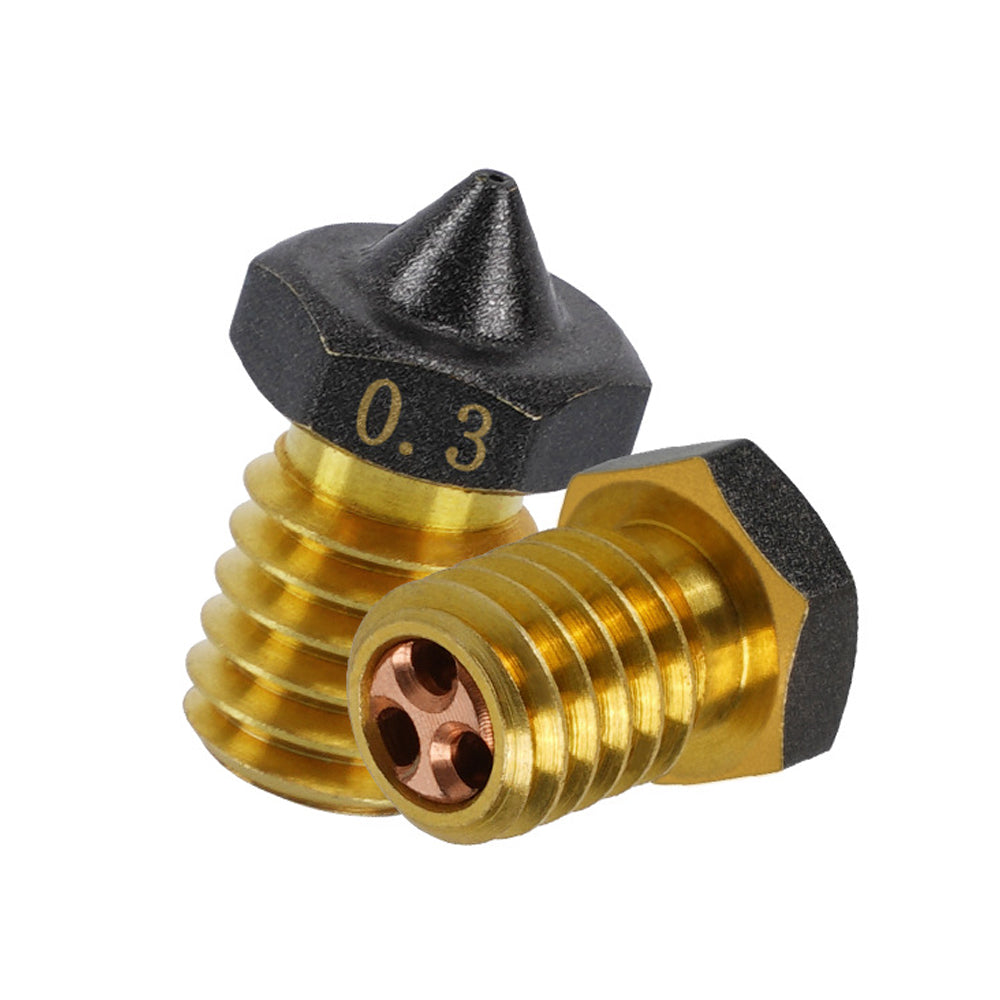 Mässingsmunstycke (V6) belagt med PTFE för att förhindra att överflödigt filament fastnar i munstycket. Detta munstycke är lämpligt för 3D-skrivare som använder 1,75 mm filament. Gängstorlek M6.