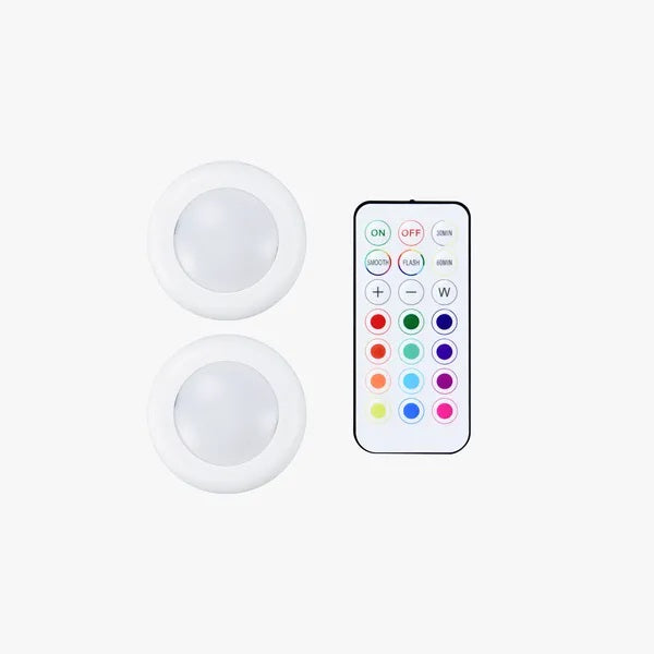 Denna uppsättning med två LED- pucklampor med fjärrkontroll är den perfekta lösningen för att skapa flexibel och dekorativ belysning i ditt hem, din verkstad eller dina 3D- utskriftsinstallationer . Varje puck är kompakt , trådlös och enkel att montera med den medföljande självhäftande baksidan – perfekt för både tillfälliga och permanenta installationer.