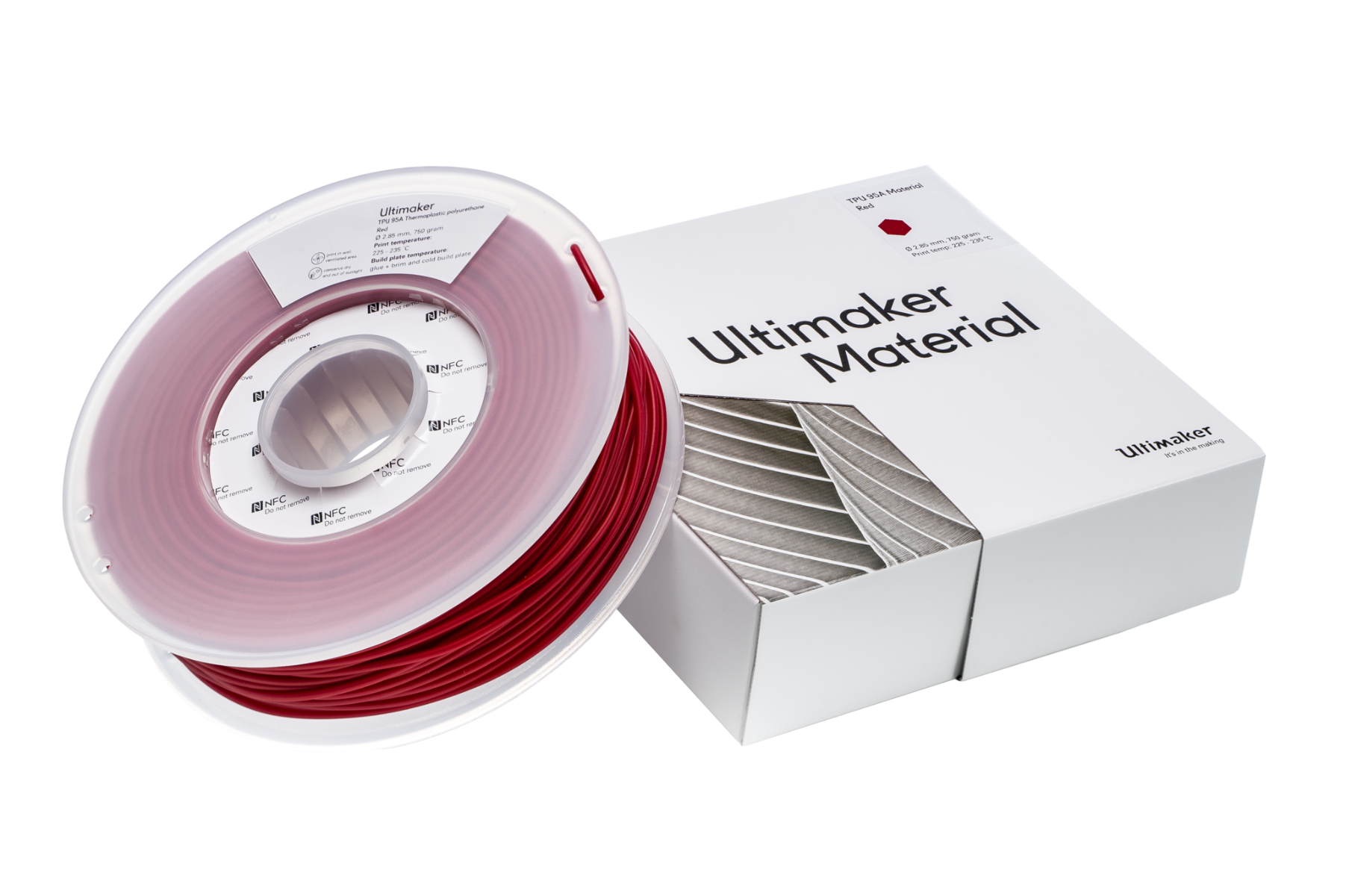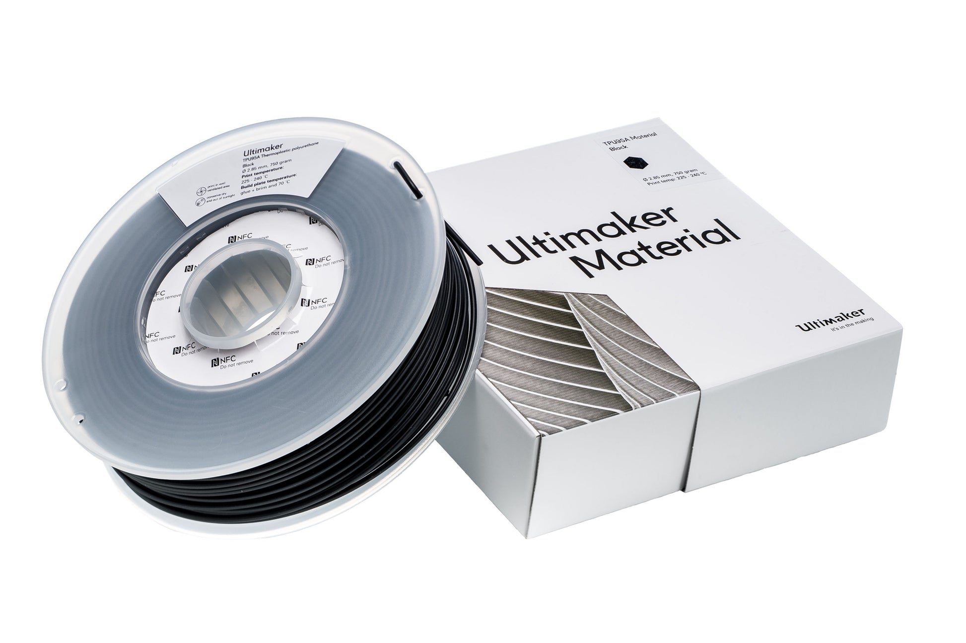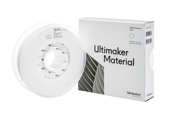 Ultimaker TPU 95A (termoplastisk polyeten) – TPU har en hårdhet på 95 (Shore-hårdhet) och kan töjas 580 % innan den går sönder. Den är avsedd för material som kräver flexibilitet och utsätts för högt slitage.