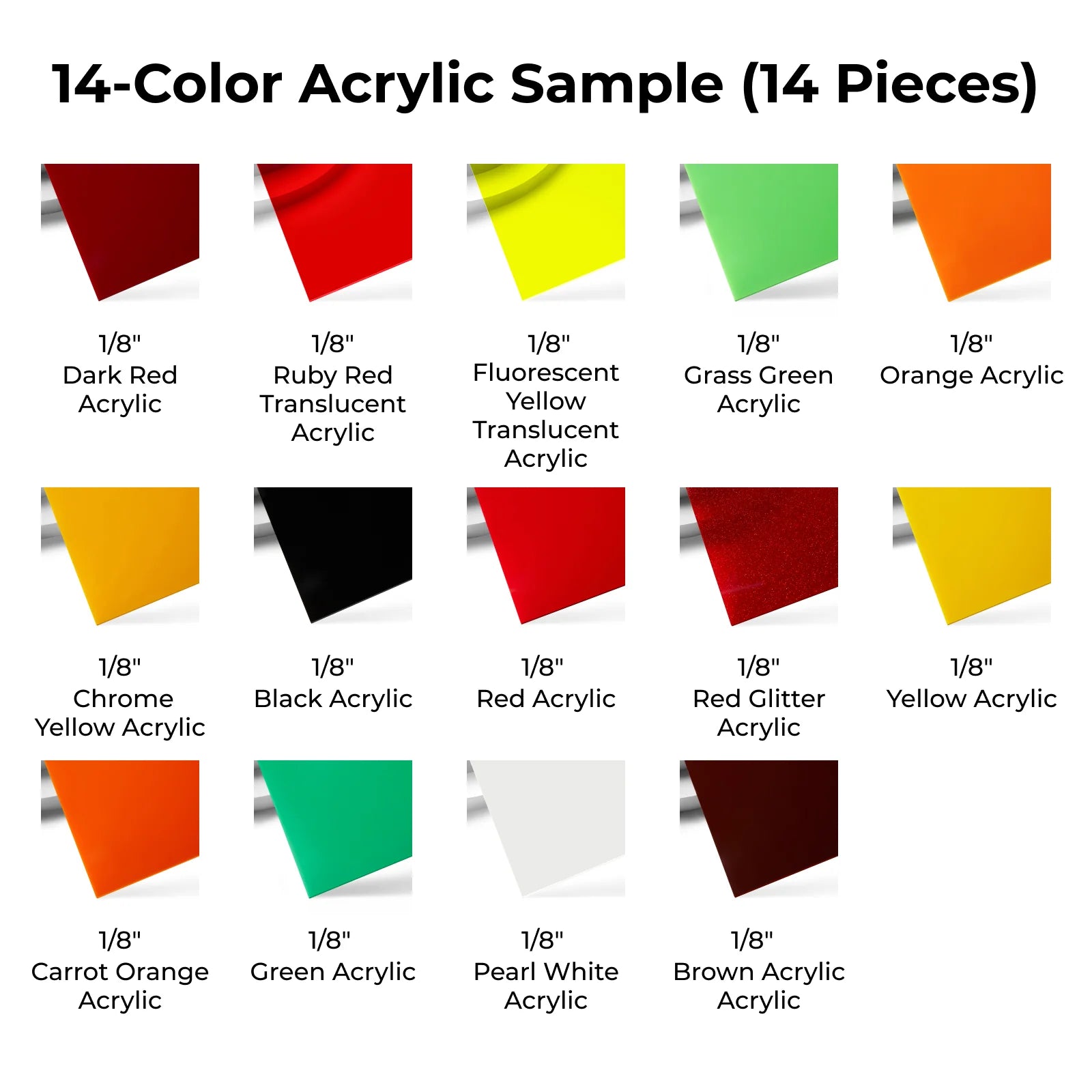 Detta färgade akrylprovset från xTool innehåller 14 vackra akrylark i olika färger, alla med en vacker, blank yta och exakt skurna kanter. Akrylbitarna är av hög kvalitet och lämpliga för både gravyr och skärning, där de ger skarpa och estetiska resultat.