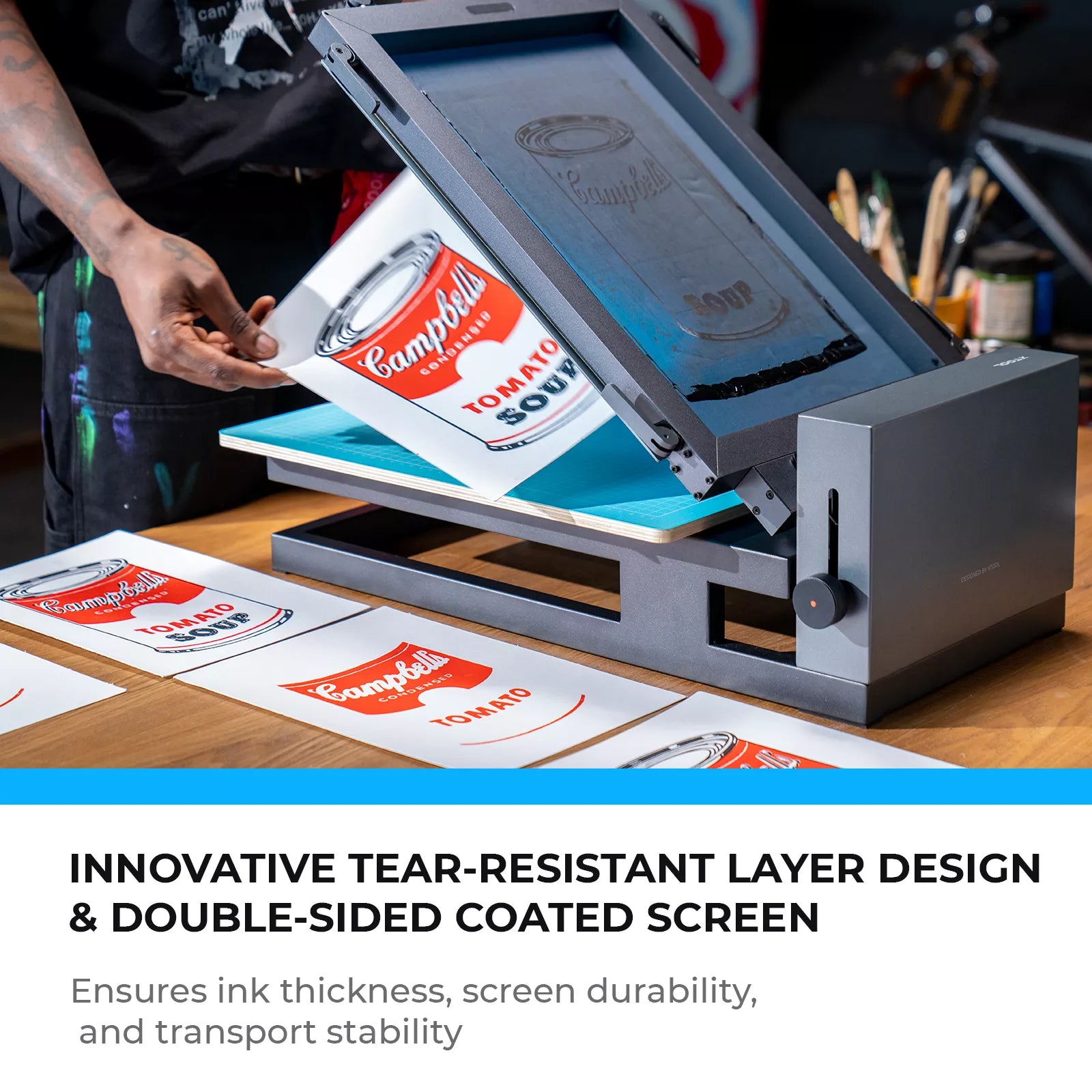 De coatede screens fungerer perfekt sammen med xTool’s levende farver og giver imponerende trykresultater på tekstiler, papir, metal og træ. Ideel til småformater som kort, 8" × 10" lærreder og materialer op til 9" × 12".